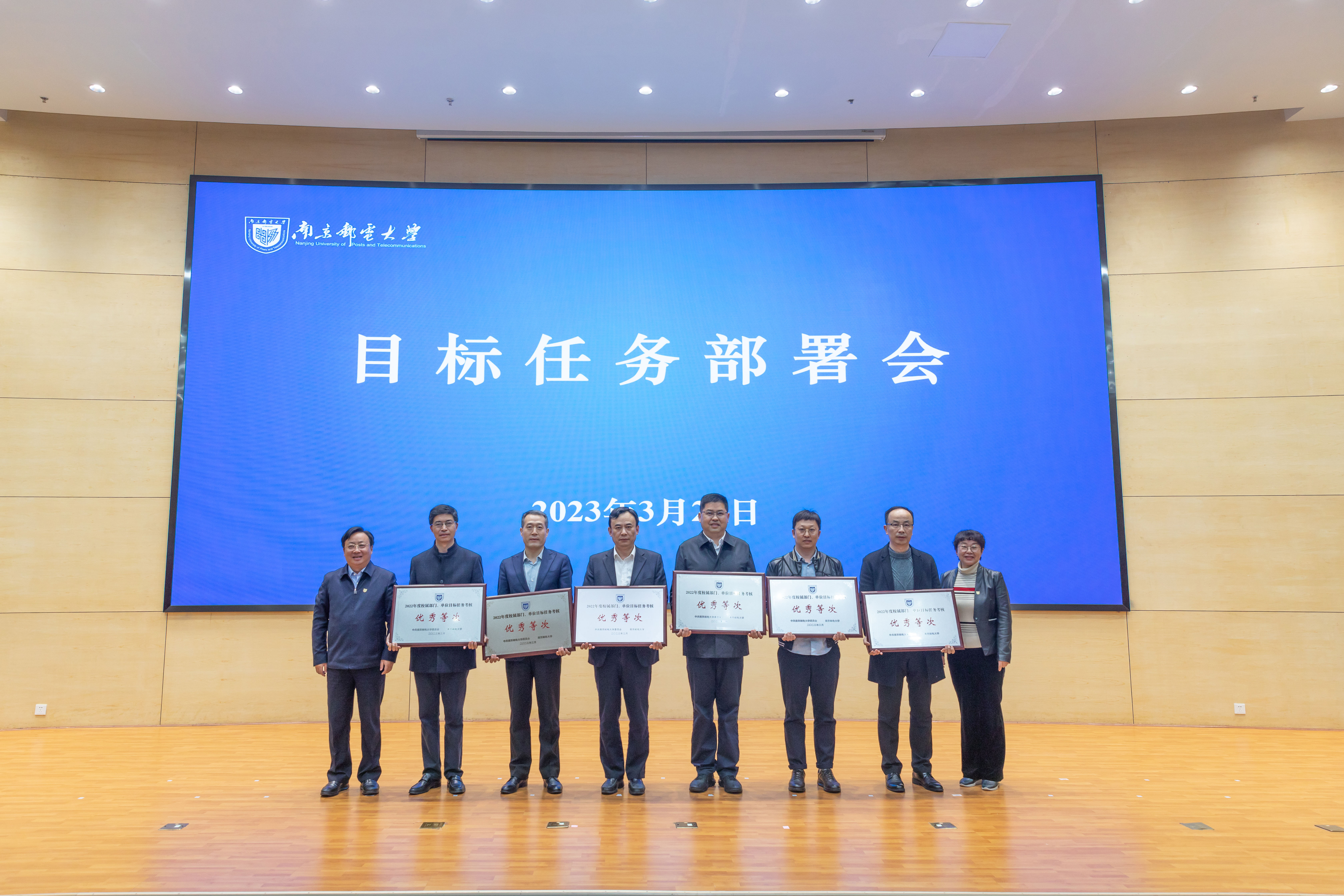 3月21日校目标任务部署会颁发2022年度目标任务考核优秀奖牌(图右4为学院领导)