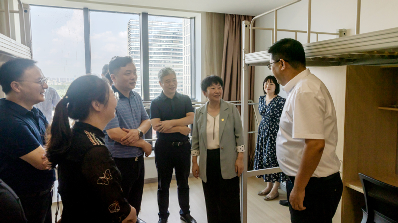 郭宇锋书记叶美兰校长逐一检查了学生公寓、学生餐厅、教学楼、实验室等改造工程建设完成情况,对浦口高新区为办学提供的超市、咖啡厅、快递点、运动健身场所等配套场所也进行了实地考察。校领导充分肯定当前改造工程取得的成绩,同时对后期改造工程交付时间节点提出明确要求,对学院学生搬迁及开学保障工作提出具体指导意见。