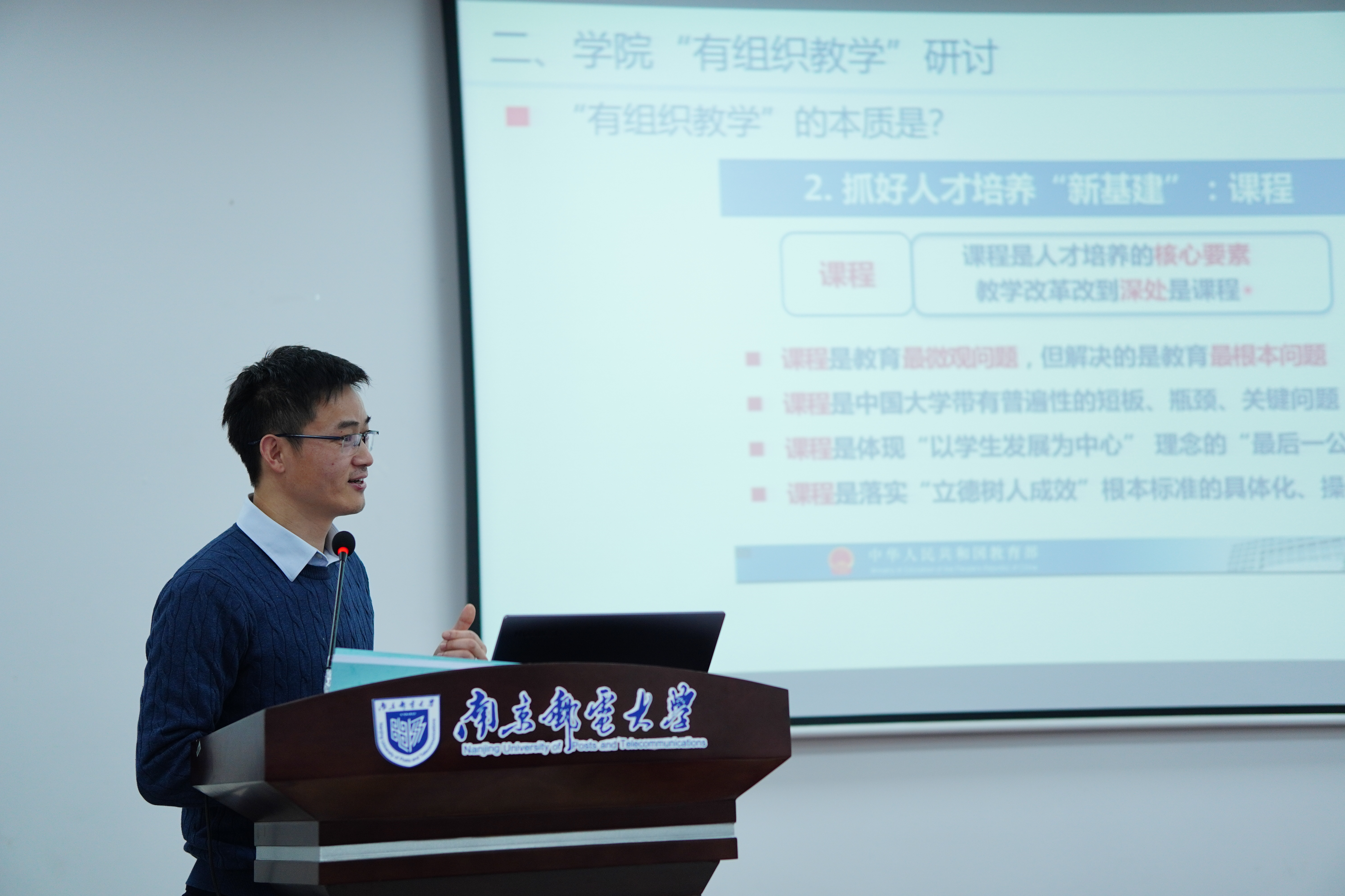靳雷生副院长围绕自评报告指标与教师关系、学院未来开展“有组织”教学两方面进行了汇报。他谈到新一轮本科教育教学审核评估以及自评报告撰写的重要意义,说明了各指标点与教师之间的关系,分析了目前自评报告反映的一些问题。接着,靳雷生副院长提到未来学院要开展有组织教学,并就有组织教学的本质含义,如何建立有组织教学,以及有组织教学组成与职能、学院资源支持等方面进行了解读。随后全院教师对自评报告以及“有组织教学”相关进行研讨。