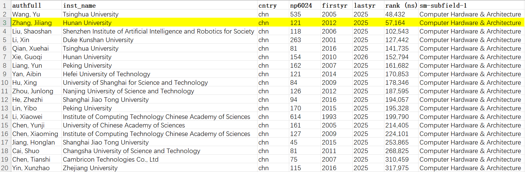 据统计,在该领域"年度科学影响力榜单"中,中国内地学者达43人,"终身科学影响力榜单"仅6人。张吉良教授在计算机硬件与体系结构(Computer Hardware & Architecture)领域中表现卓越,已连续六年入选“全球前2%顶尖科学家榜单”,并始终稳居该领域中国学者的前三名。这一系列荣誉彰显了张吉良教授在计算机硬件与体系结构领域的影响力,为推动该领域的发展作出了重要贡献。