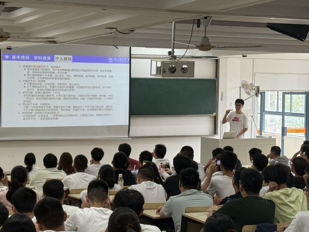在创新实践板块,顾钰和杨君威同学系统介绍了创新保研政策,结合自身参与EDA精英挑战赛、全国大学生数学建模竞赛(A类)等大型赛事的经历,生动讲述了如何高效利用校院资源、选择竞赛项目、组建团队以及与指导老师协作,鼓励大家积极投身创新创业活动。