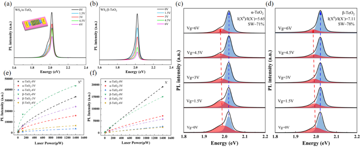 图2. WS2/β-TeO2异质结可重构的光致发光特性